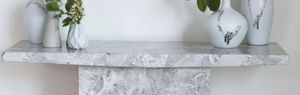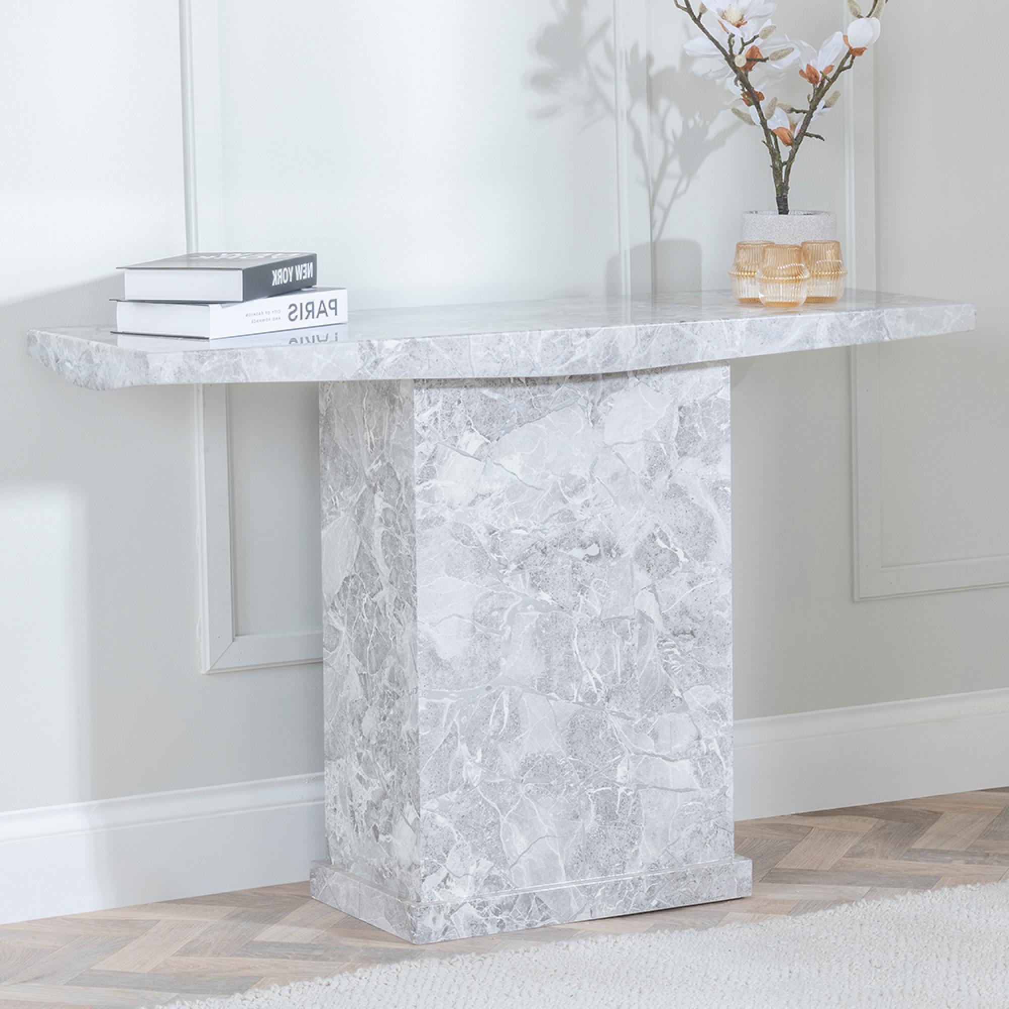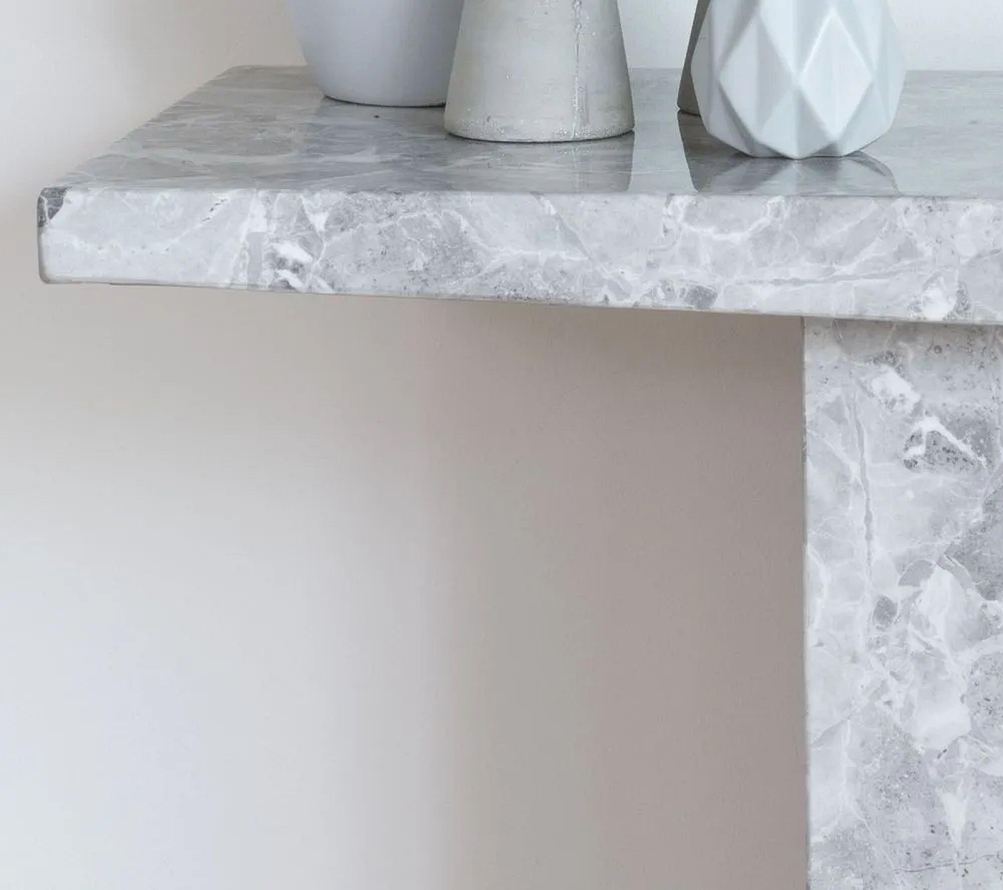 This is a stylish and elegant console table in grey that is made from engineered marble. Special pedestal base ensures stability and durability of the piece. It features a square top without any storage options. The flat packed design makes it easy to assemble and the contemporary color makes it a perfect addition to any room.