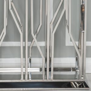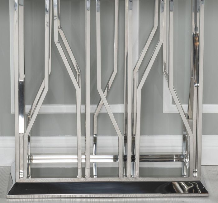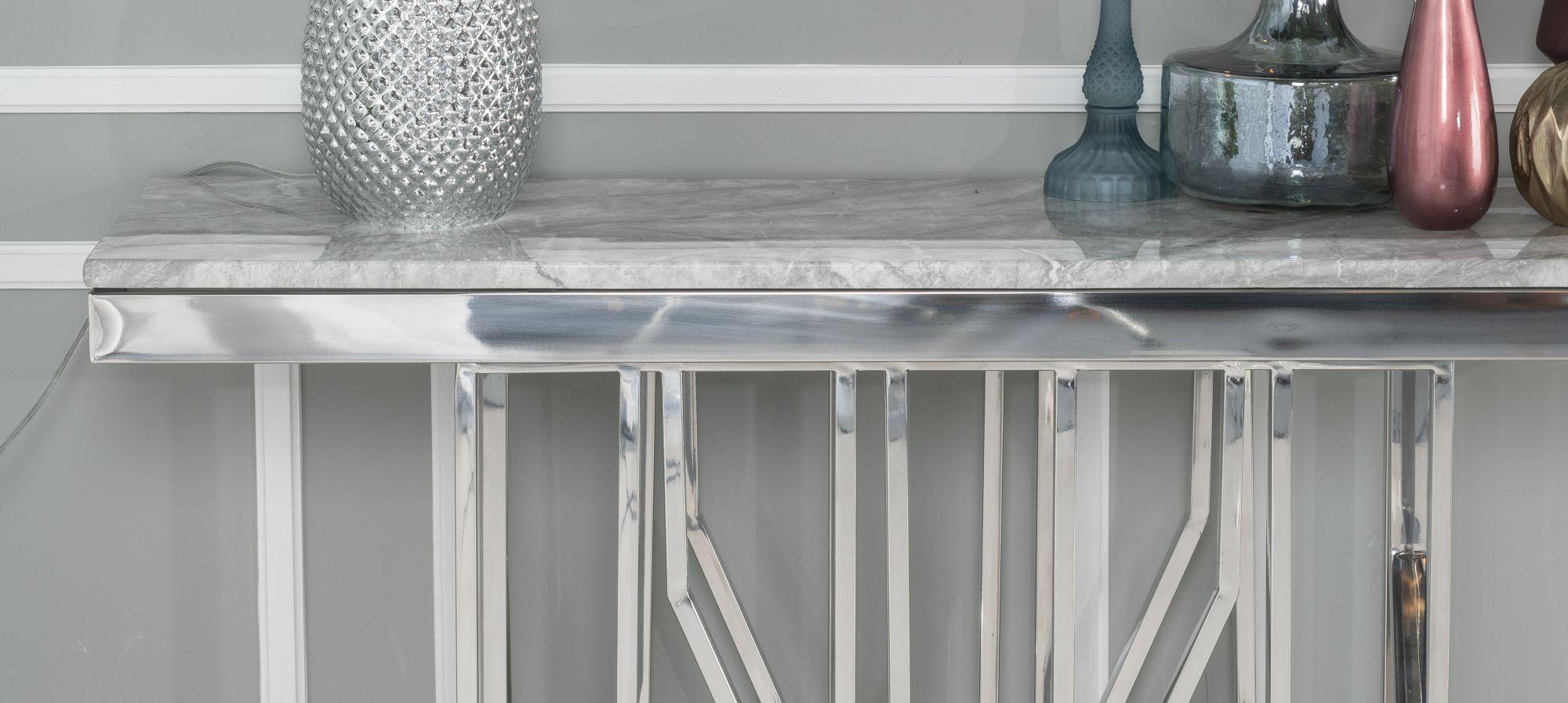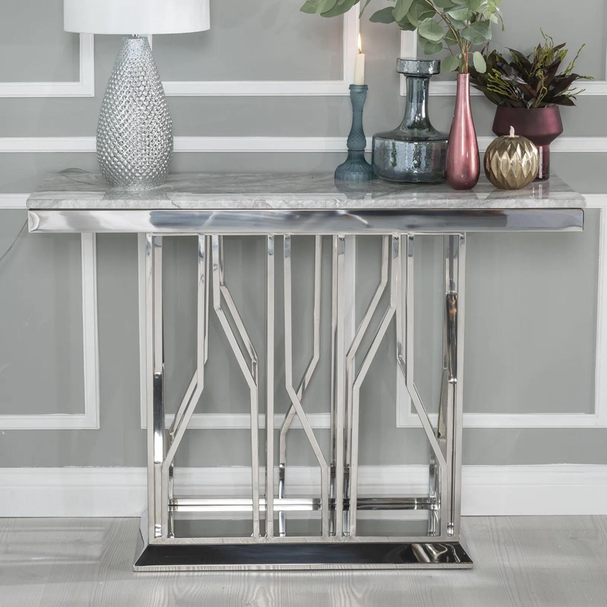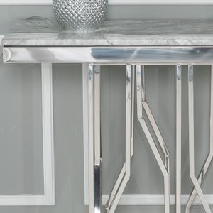 This contemporary rectangular console table is crafted from engineered marble and stainless steel for a modern look. It features an elegant grey marble top, and the base is finished off in sleek chrome for a polished touch. Perfect for the entryway or living room, this chic table adds effortless style and sophistication to any space.