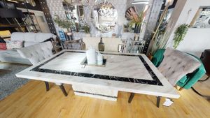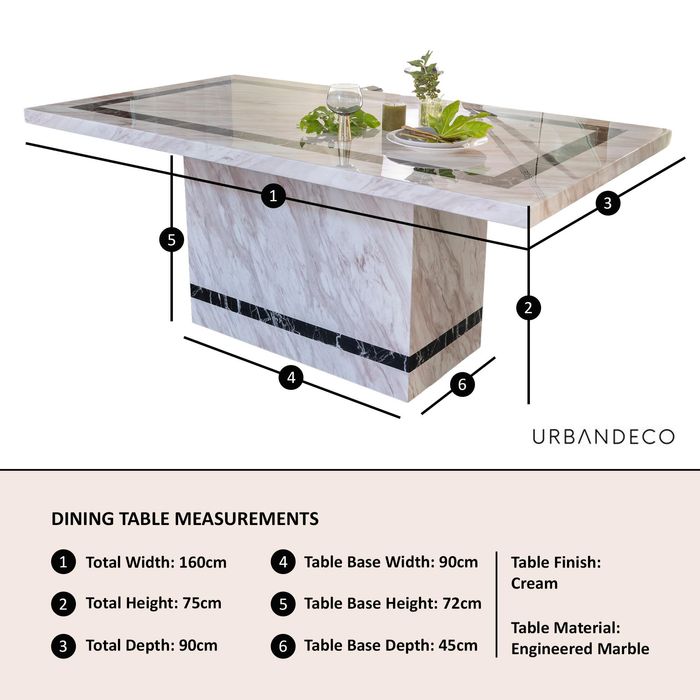 This dining set is a great addition to any home decor. Crafted with an engineered marble top, this rectangular dining table features a sturdy pedestal base with a cream finish. With seating for up to six people, it's perfect for family dinners, game nights or casual gatherings. Enjoy smart elegance with this stylish and modern dining set.