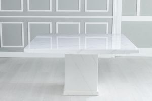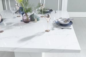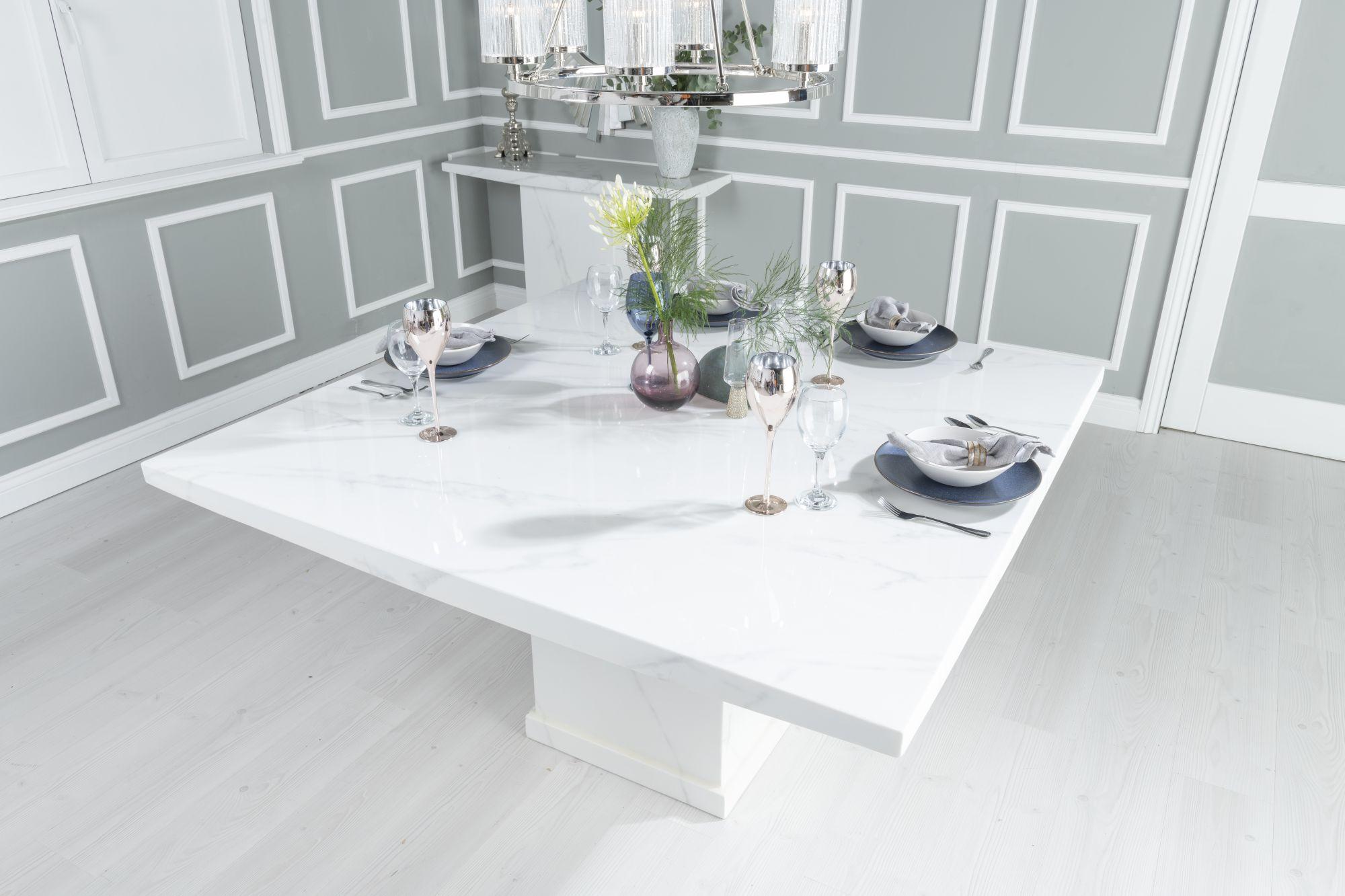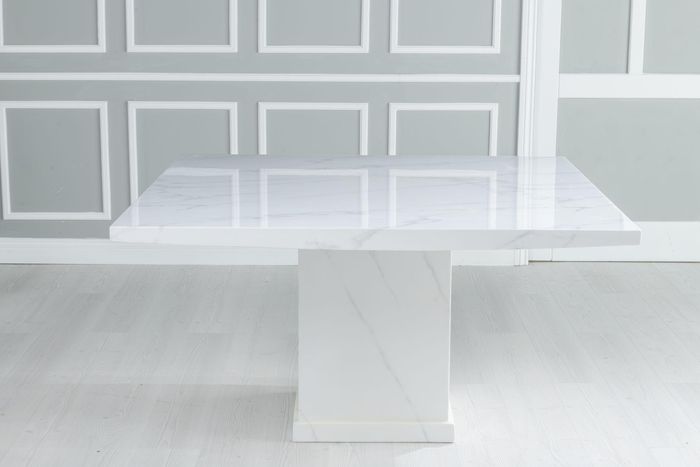 This elegant engineered marble dining table seats up to 8 diners. With its square top and bold pedestal base, this contemporary design provides a chic aesthetic to any dining space. Finished with a beautiful white gloss, it adds a touch of modern luxury to your home. Perfect for any dinner party or family gathering.