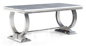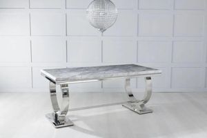 This modern dining table is stylishly designed with a grey rectangular top and gleaming chrome base. Crafted with engineered marble and stainless steel, it has a sleek finish and comfortably seats up to 6 people. Perfect for any home or dining space, this timeless piece showcases the perfect combination of function and style.