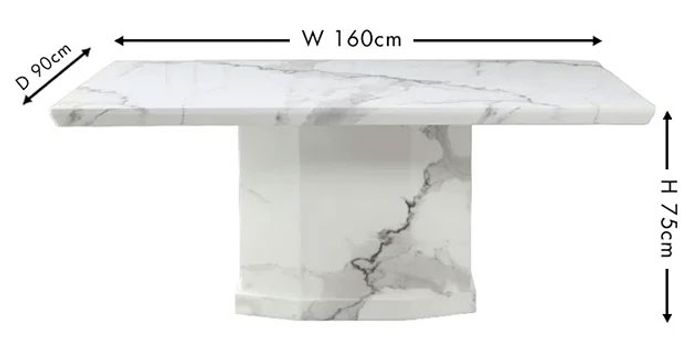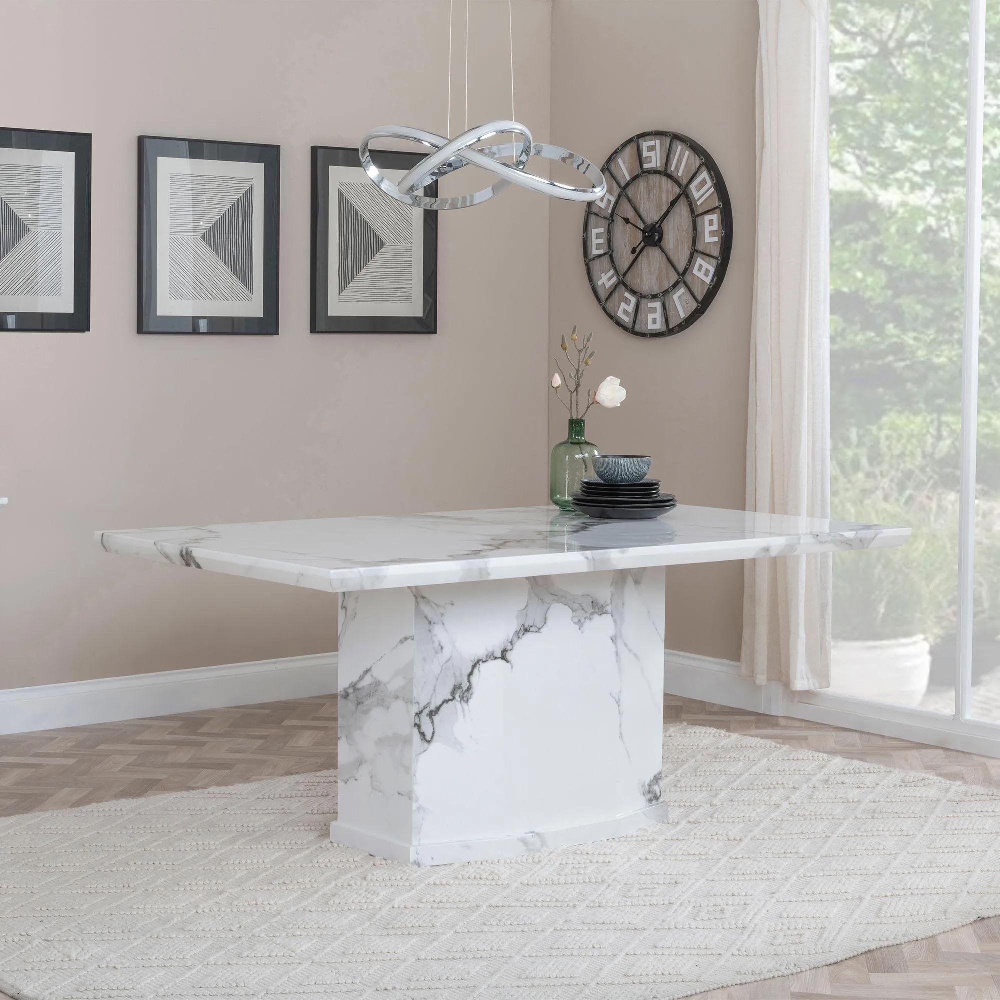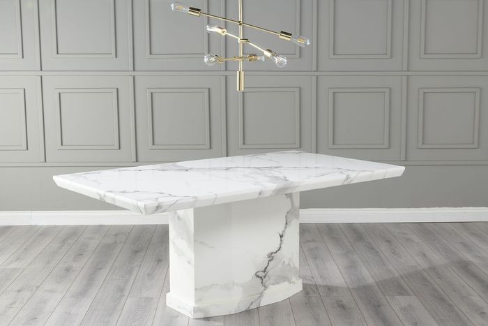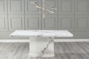 A stunning dining table in white engineered marble, boasting a rectangular top and pedestal base for a timeless look. With seating for 6, this piece is a beautiful way to add sophistication to any room. The perfect finishing touch to any modern home.