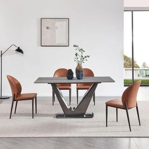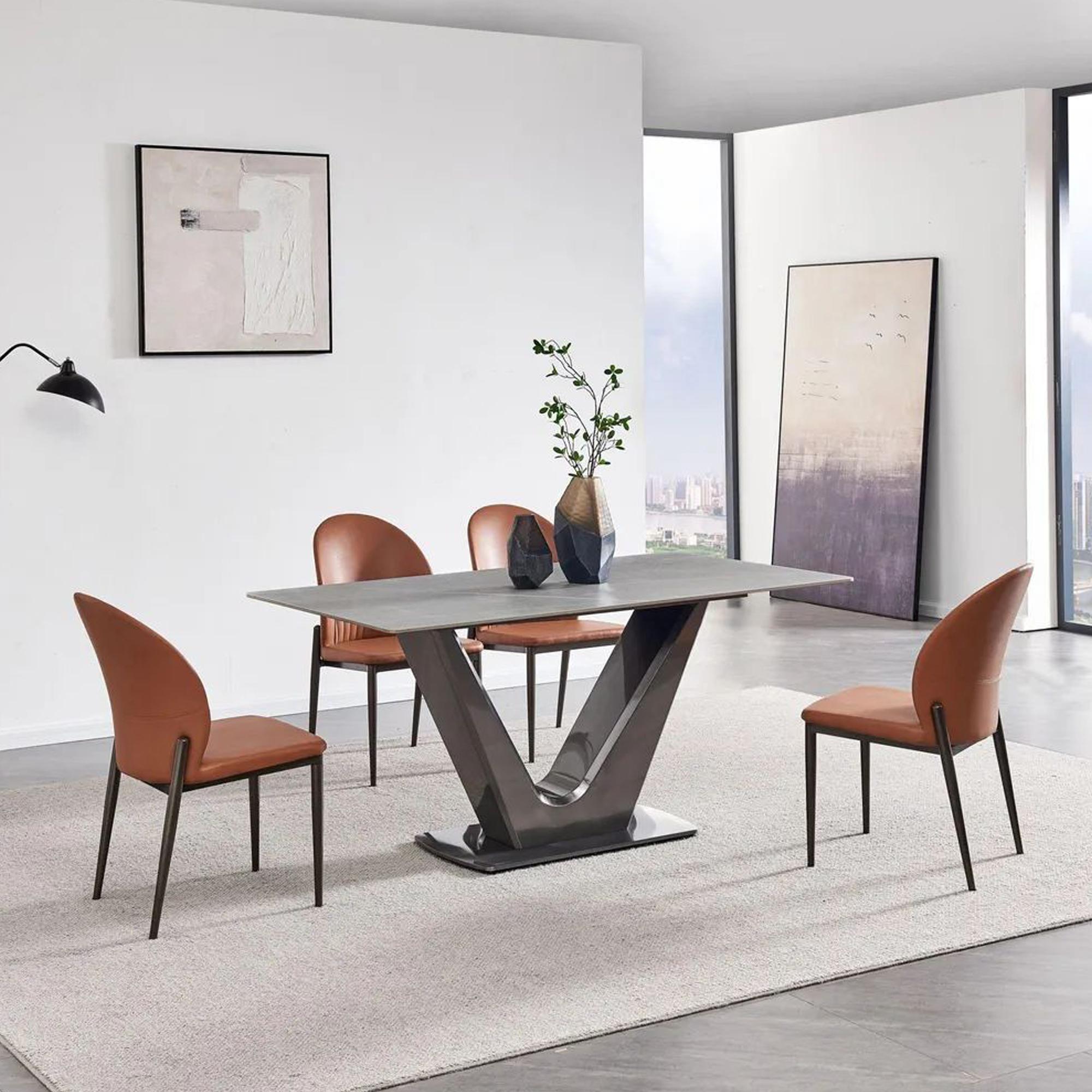 An elegant dining table designed for lasting beauty. This table is crafted from sintered stone and metal to create a durable, structured design with an outstanding grey and black finish. Perfectly complemented by the V pedestal base, this rectangular, flat-packed piece is the ideal addition to your dining room decor and features a fixed top.