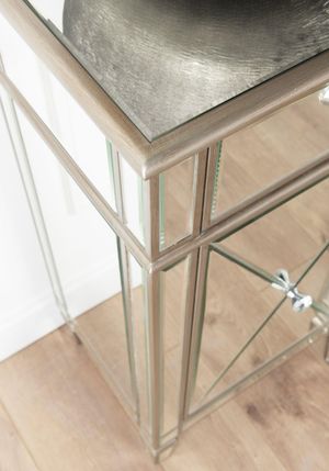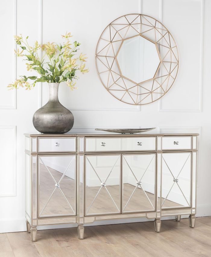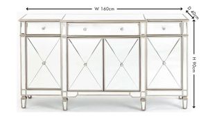 This spectacular sideboard brings a little dazzling luxury to the home. Featuring four doors and three drawers with mirrored panels, champagne trim and MDF frame, this piece is sure to make a statement. The elegant design is perfect for those looking to add style and convenience to their living space.