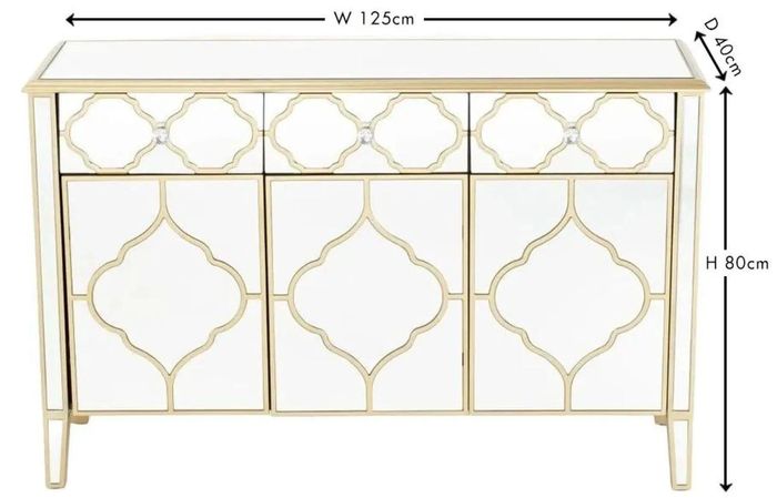 This sideboard has an elegant gold mirrored finish and has been assembled for convenience. Featuring three doors and three drawers, this large sideboard offers plenty of storage space. It is made of a durable MDF material to ensure lasting use and a luxurious look in any space.